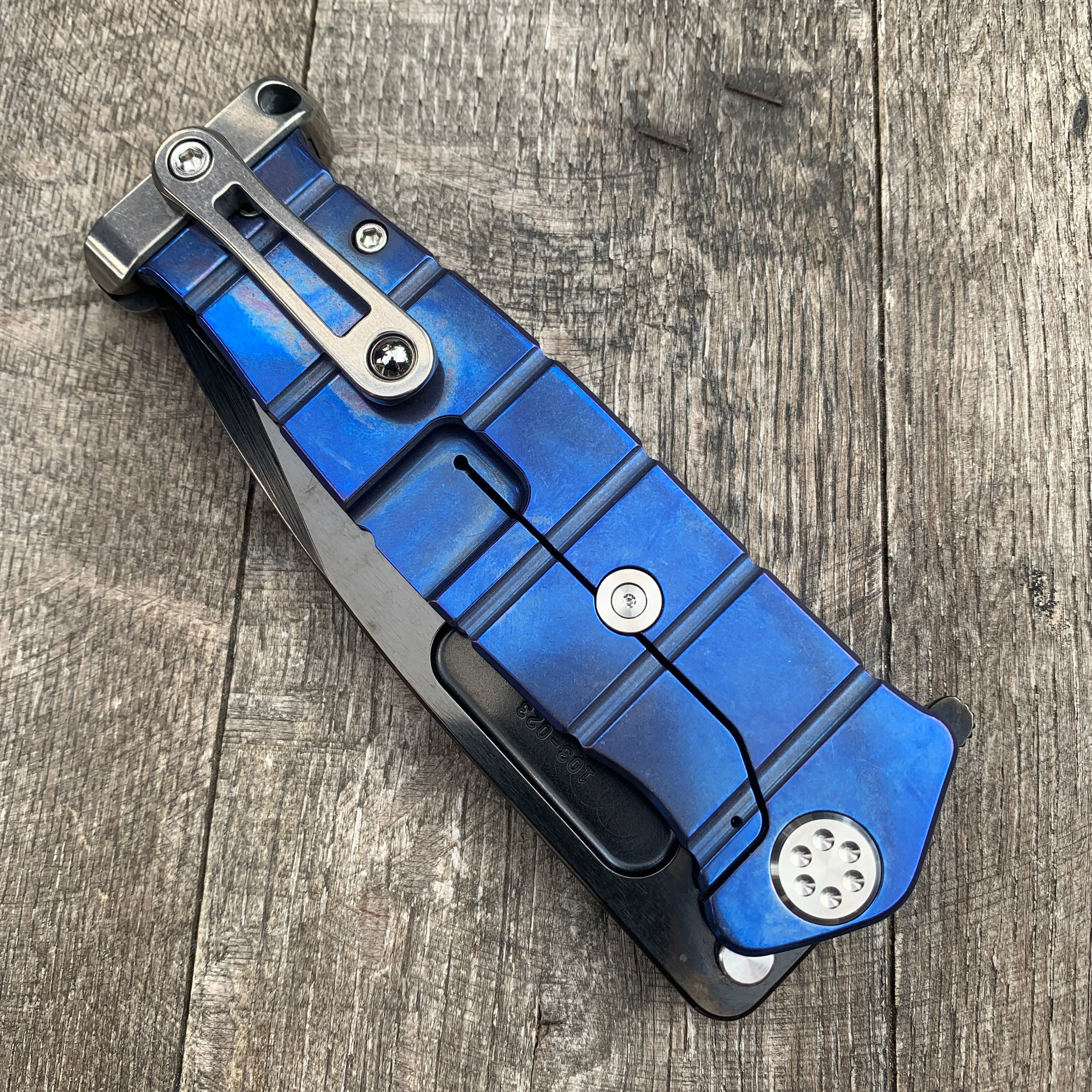 The Medford USMC Fighter Flipper is a cool pocket knife, based on the famous fixed USMC-fighters knife. Greg Medford turned this iconic design into a decent pocket knife. You open it with the flipper, or the royal thumb slot. The large handle is made from titanium and like with the fixed version the handle has been enhanced with grooves. In between the titanium scales you will find a titanium backspacer which is placed on the handle like a type of 'buttcap'. According to Medford this is extremely difficult and expensive to produce, because it is difficult to clamp it in a milling machine and because the tolerances are very strict.